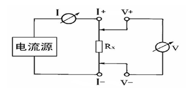 由電流源經(jīng)“I+、I-兩端口(也稱I型口),供給被測電阻Rx電流,電流的大小有電流表I讀出,Rx兩端的電壓降“V+、V-”兩端口(也稱V型口)取出,由電壓表V讀出。通過對I、V的測量,就可以算出被測電阻的阻值。