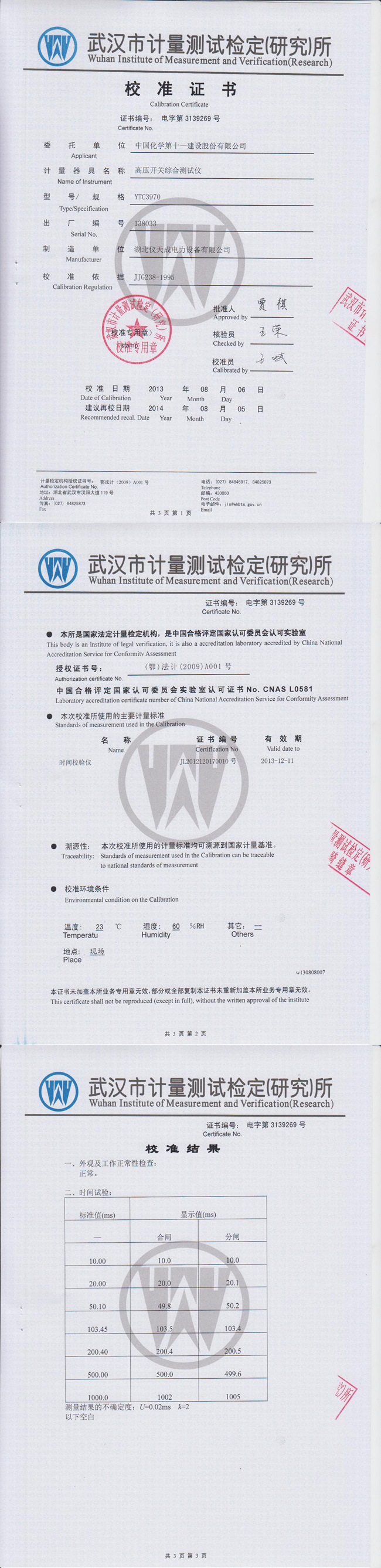 YTC3970高壓開(kāi)關(guān)動(dòng)特性測(cè)試儀鑒定證書(shū)