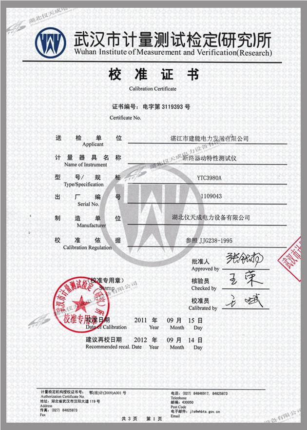 轉(zhuǎn)載:"3980A斷路器動特性分析儀鑒定證書" 請注明來源于儀天成電力。 更多技術(shù)問題請致電儀天成電力客戶服務(wù):027-87876585,技術(shù)部專線:027-87876585,在線客服: